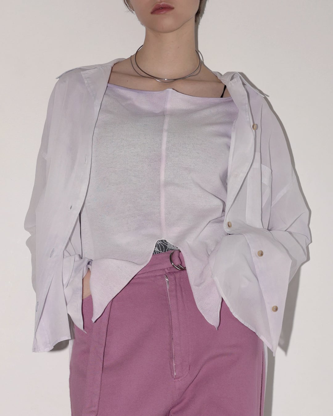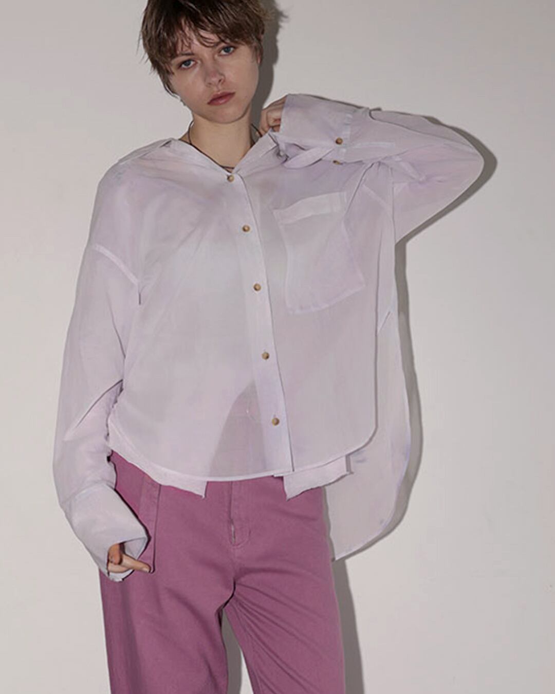 さりげない透け感のオープンカラーシャツ。
