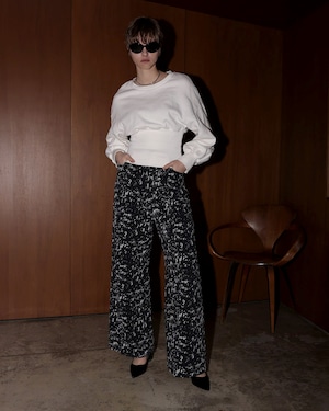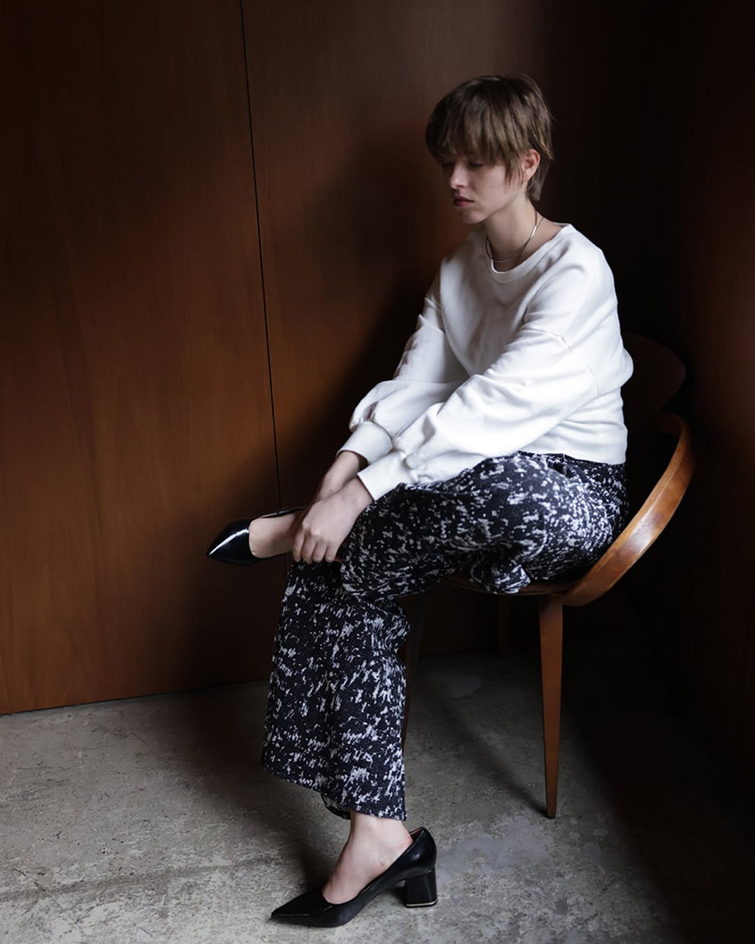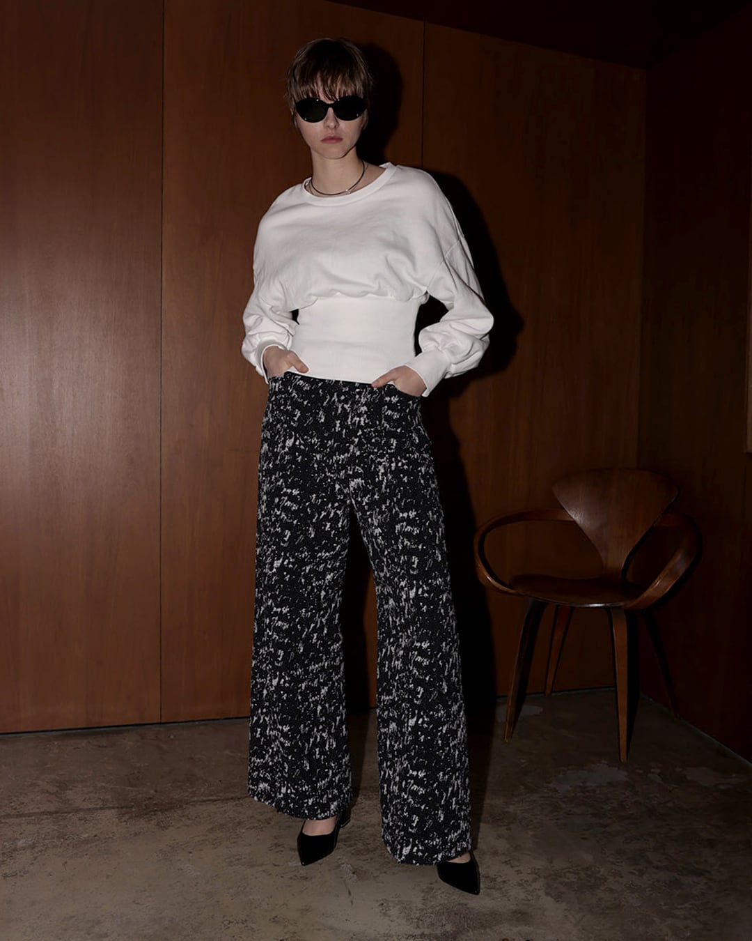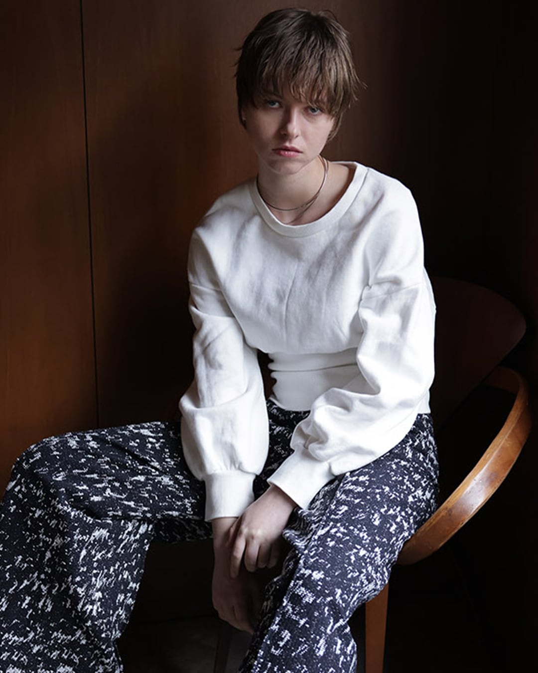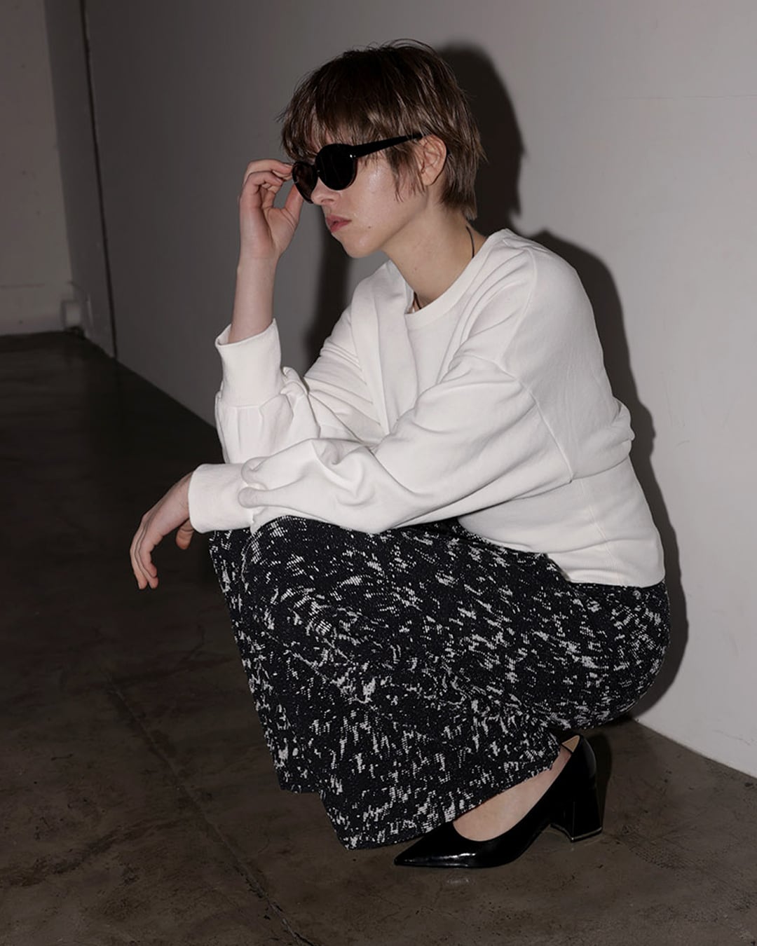 ドロップショルダーで袖はかなり長め。ウエスト部分はリブの別素材を使用。