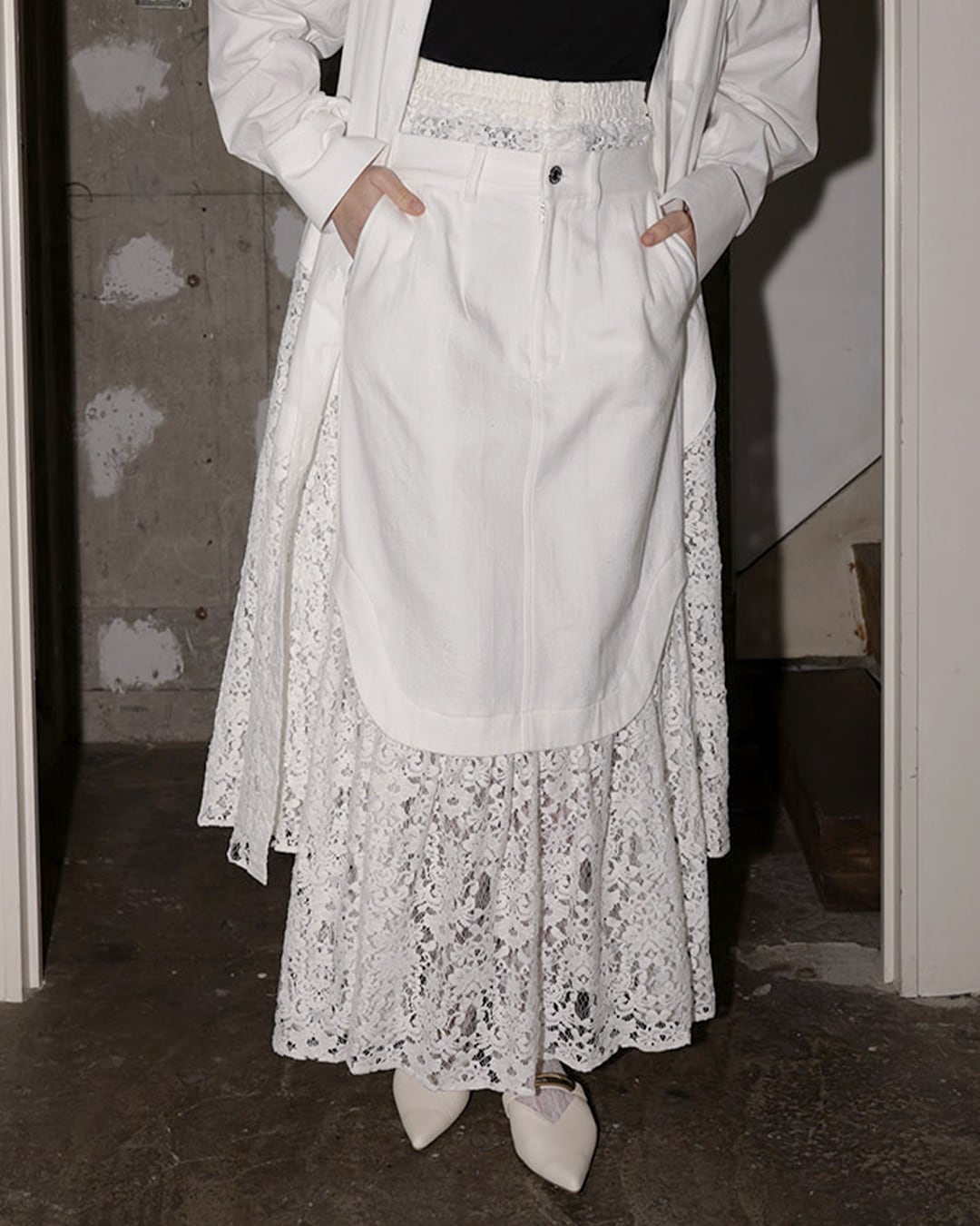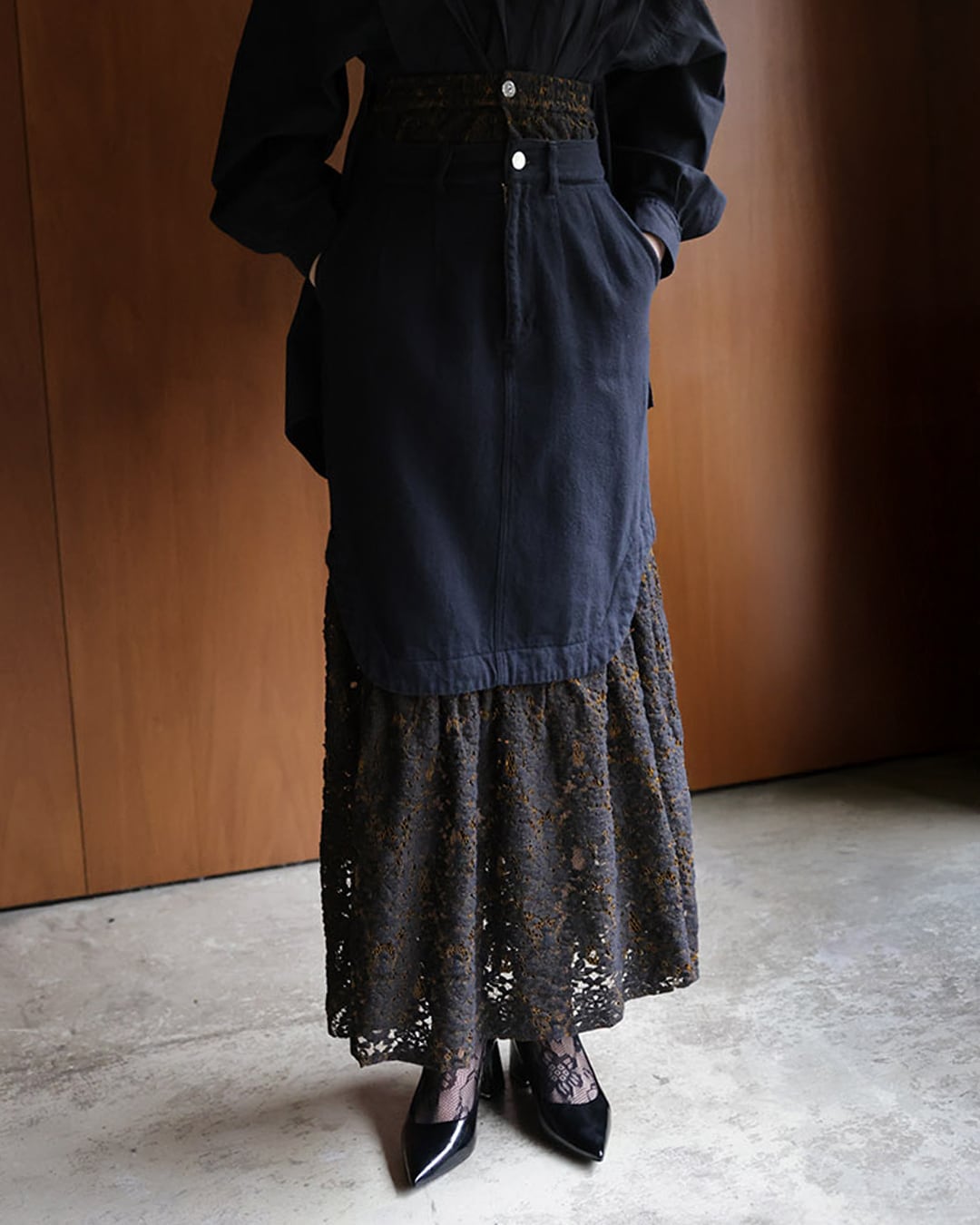 レースとネルを重ねたデザインが印象的なロングスカート。