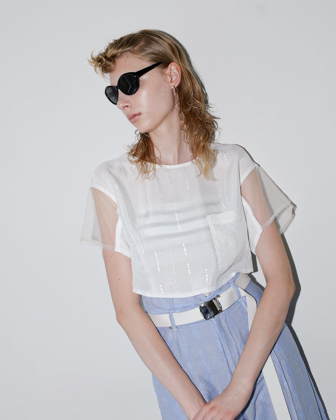 ツヤのあるジャガード生地と透け感のあるチュール素材をドッキングしたショート丈トップス。