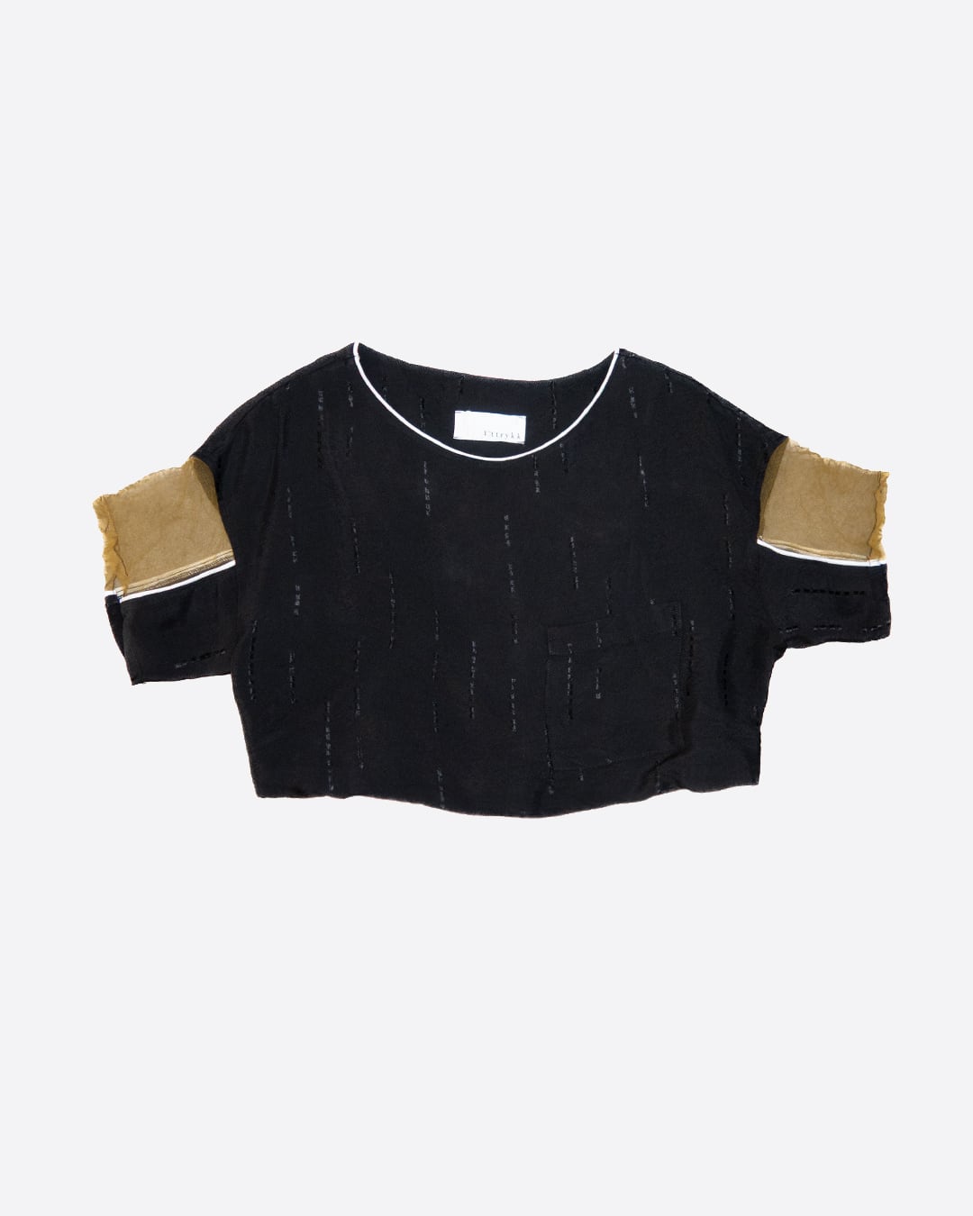 A cropped top combining sheer tulle with jacquard fabric.