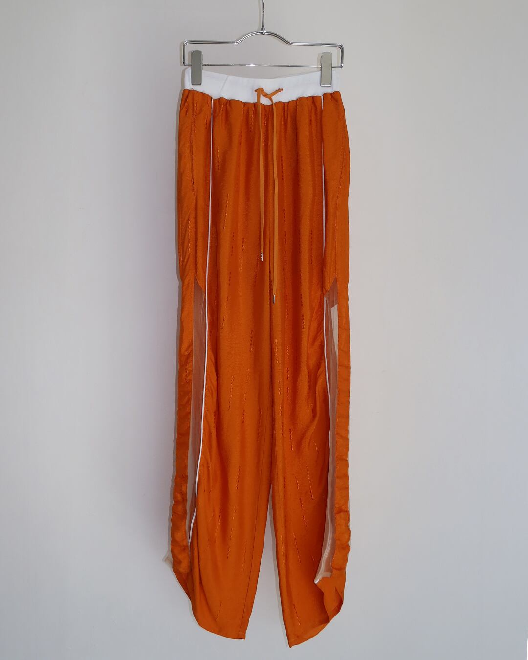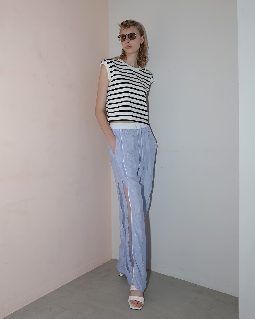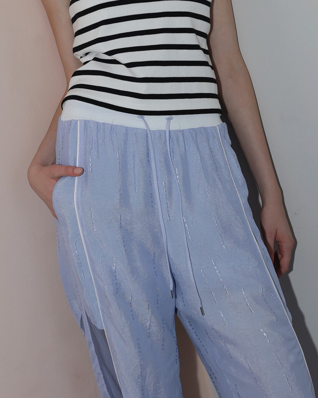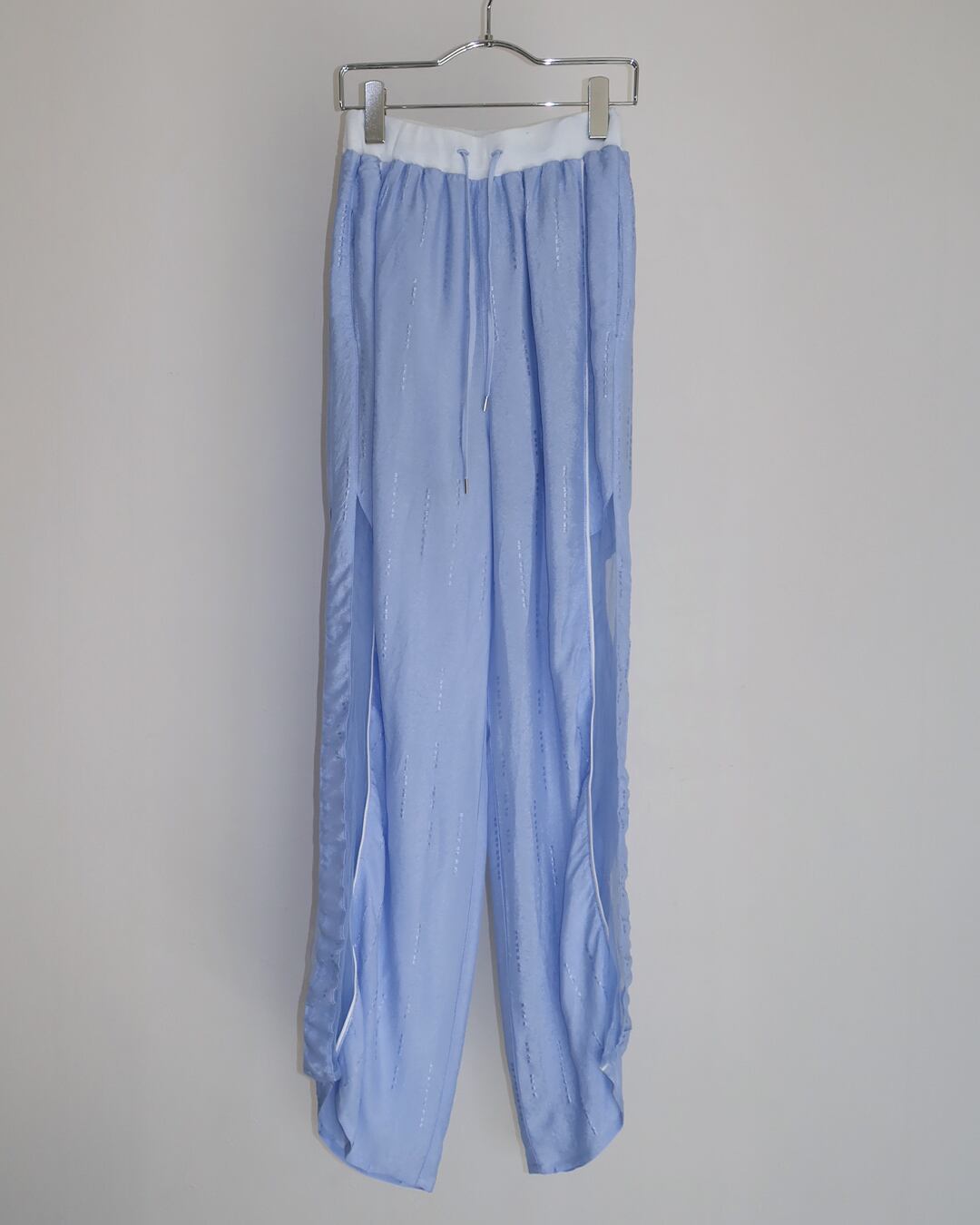 Wide-leg pants featuring sheer tulle panels and white piping for a sporty finish.