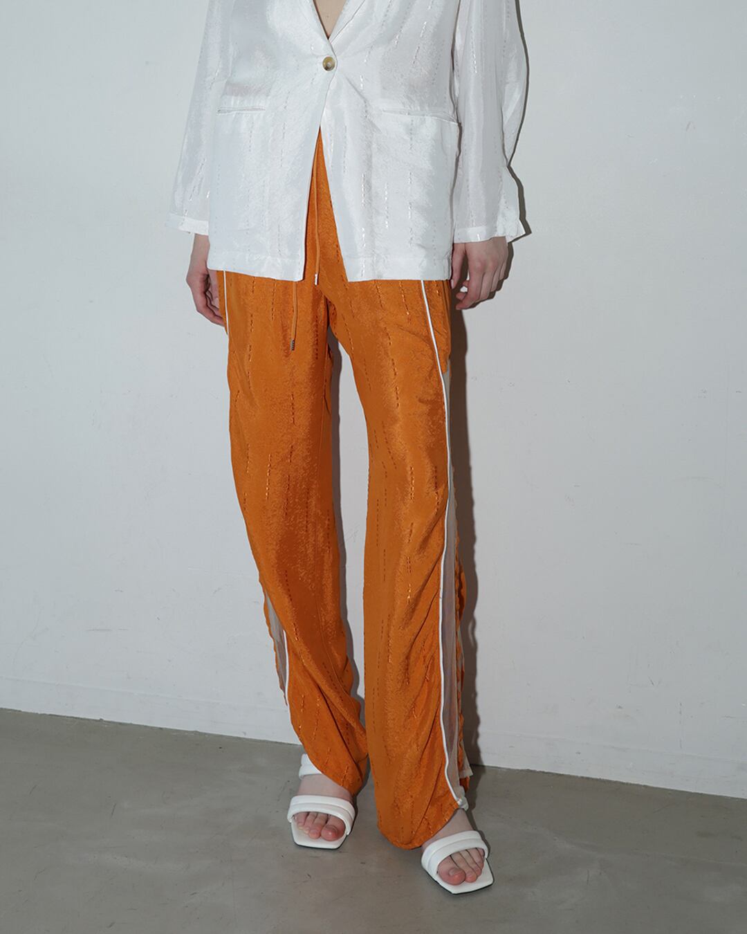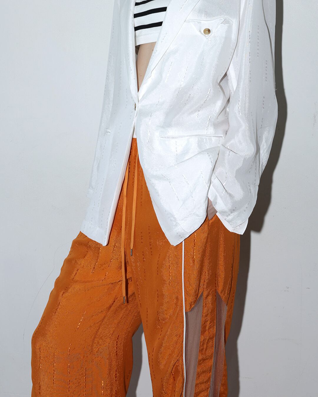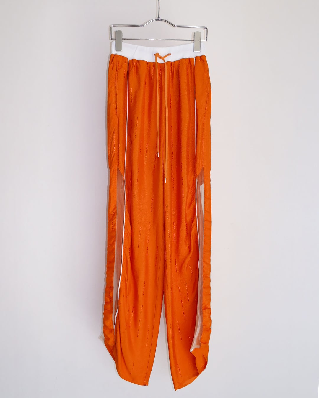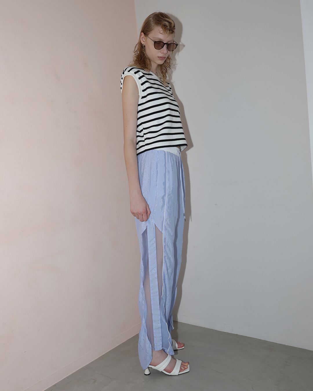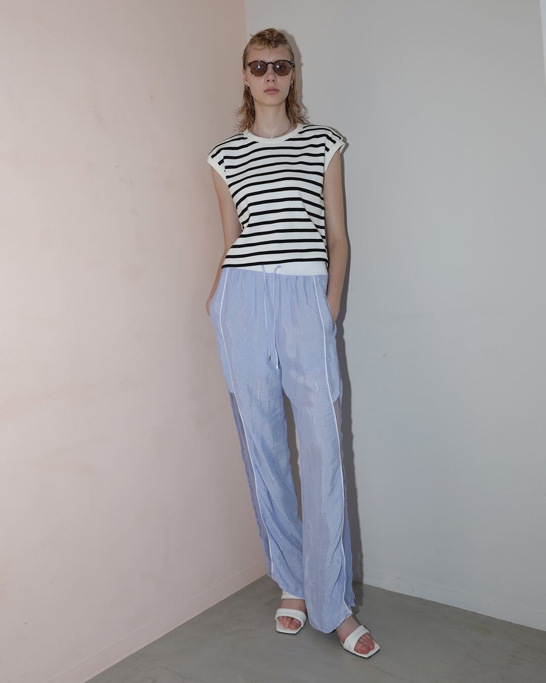 Wide-leg pants featuring sheer tulle panels and white piping for a sporty finish.