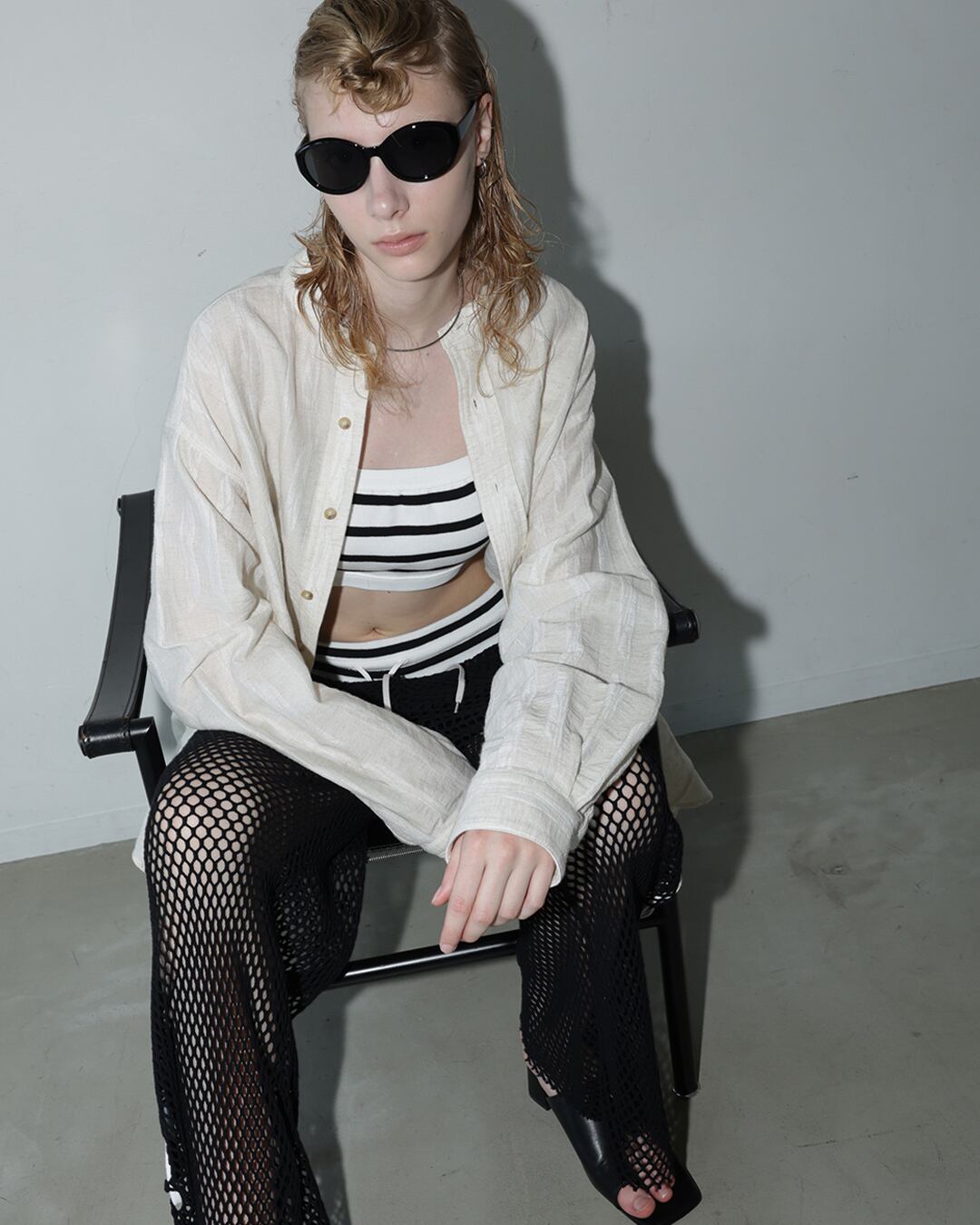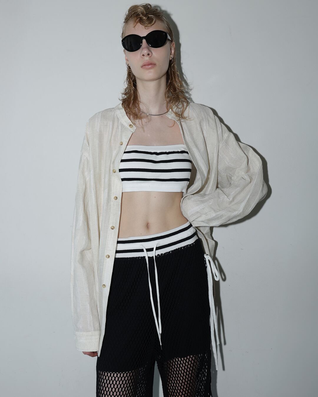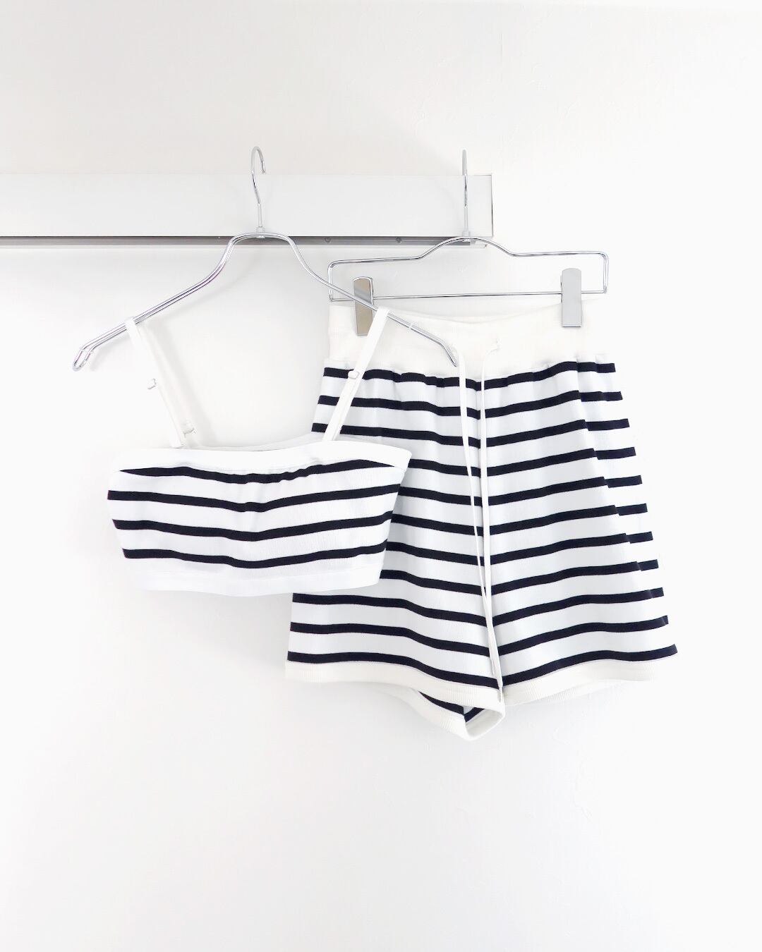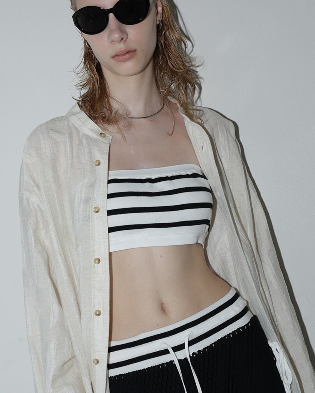 A straight-lined tube top in soft, medium-weight striped knit. Minimal design makes it perfect as an underlayer for sheer tops while adding a seasonal touch.