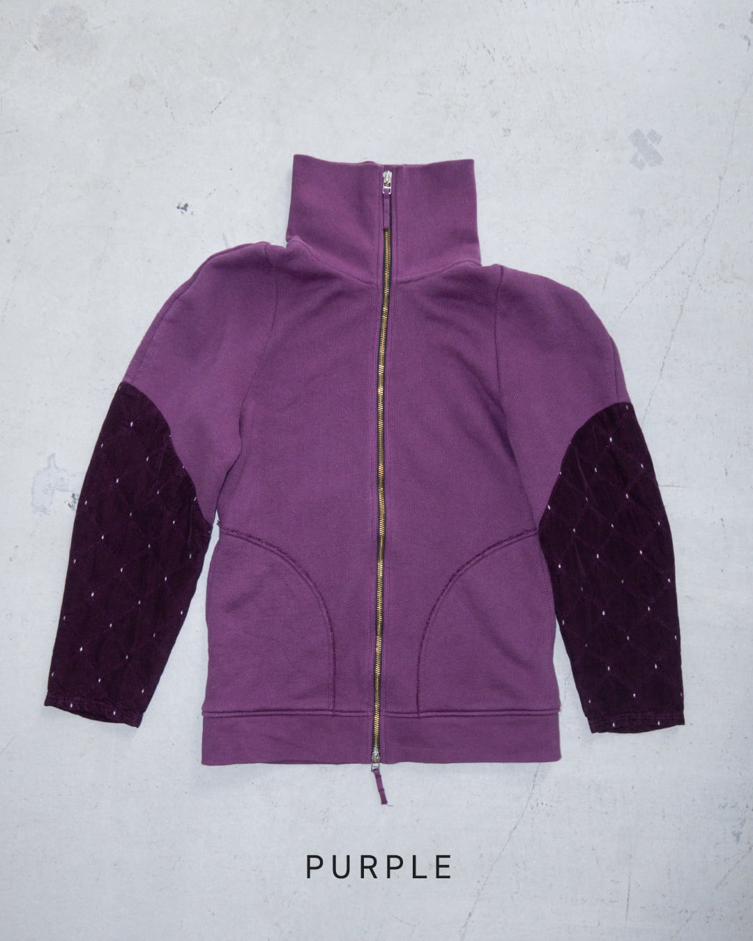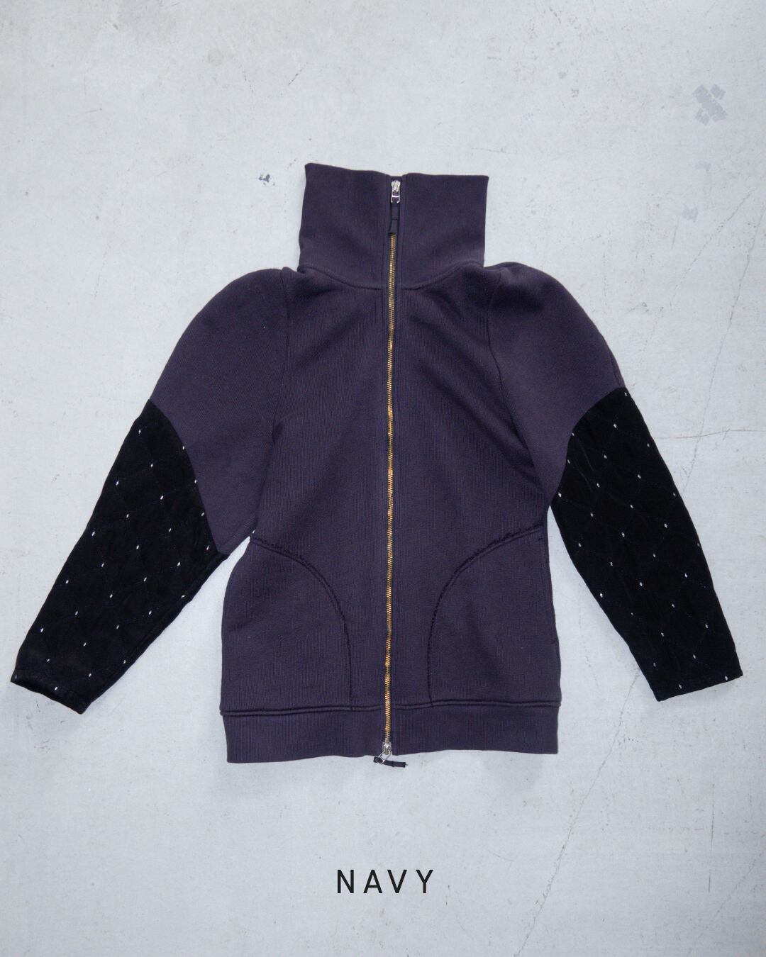 裏毛ニット × キルト風ジャガードを組み合わせた、ハイネックのスウェットプルオーバー。