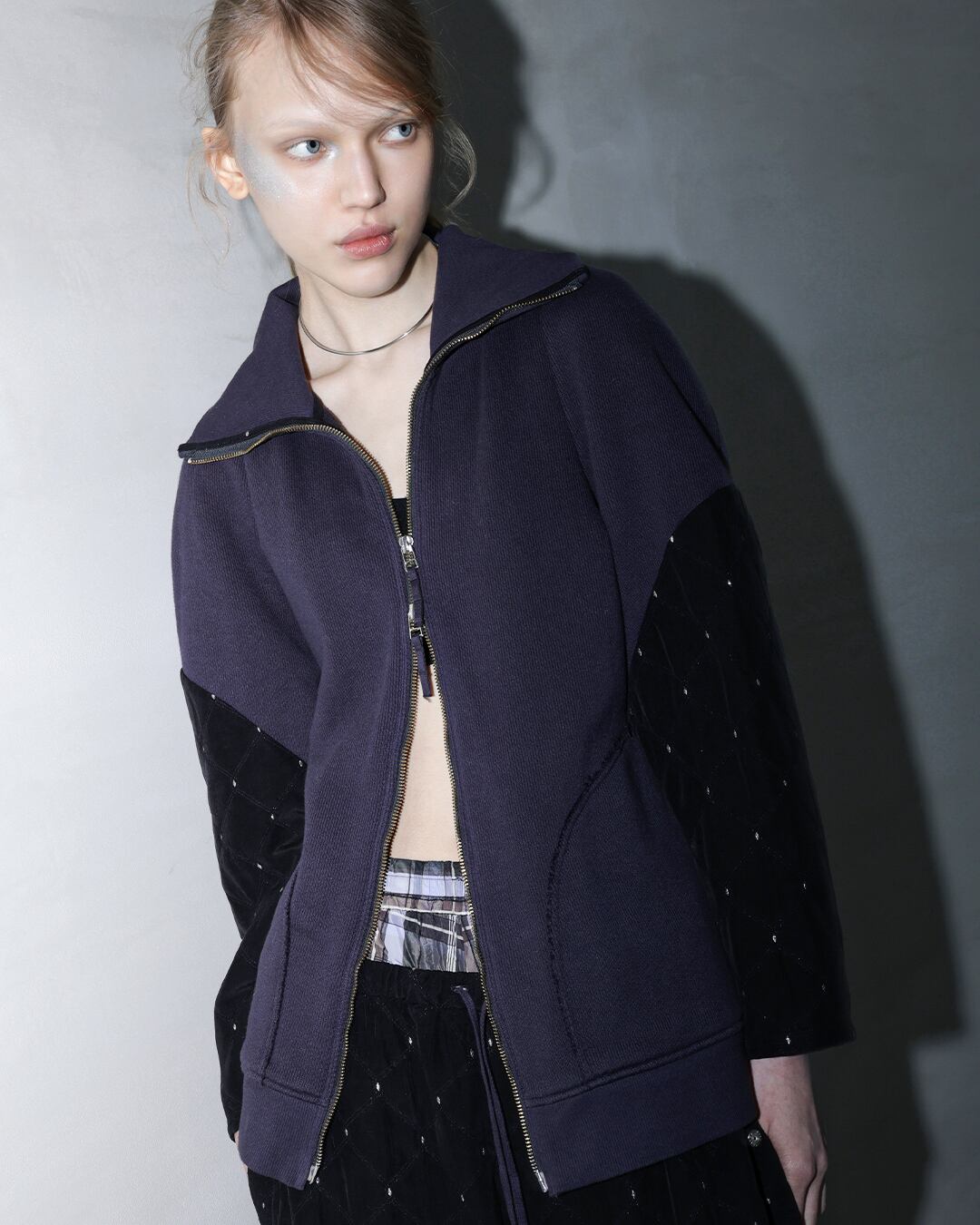 フロントのファスナーは上下どちらからも開け閉め可能。胸元までファスナーをおろせばオープンカラーのような着方も楽しめます。