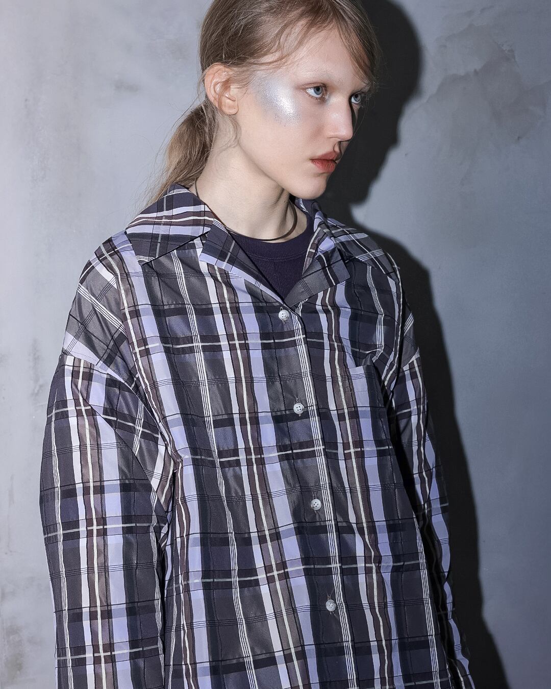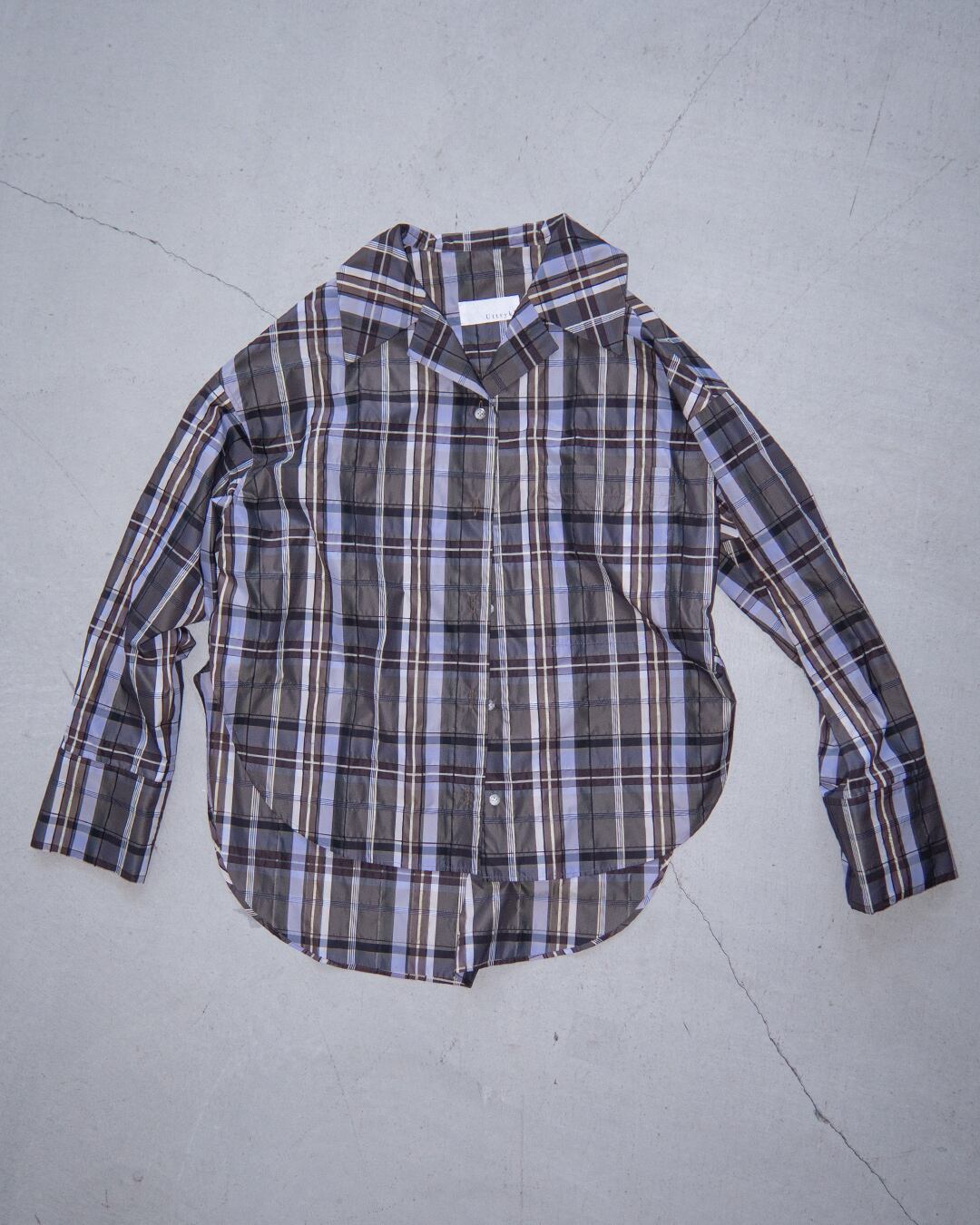 配色のチェック柄が映えるオープンカラーシャツ。
