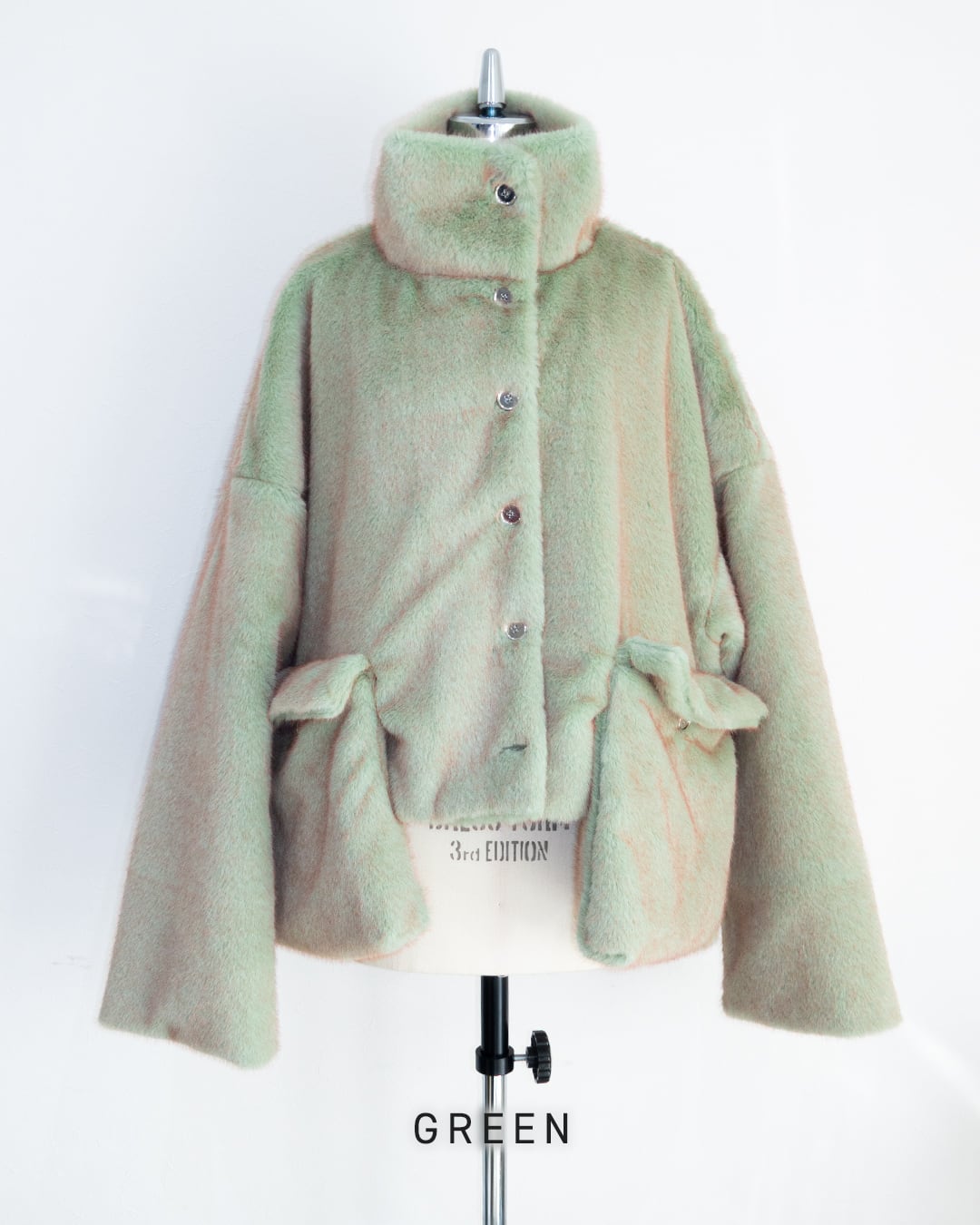 Green:ボリュームのある密度が高く毛足の短いファー素材。薄いグリーンベースに毛先は明るい赤茶色の個性的な配色。