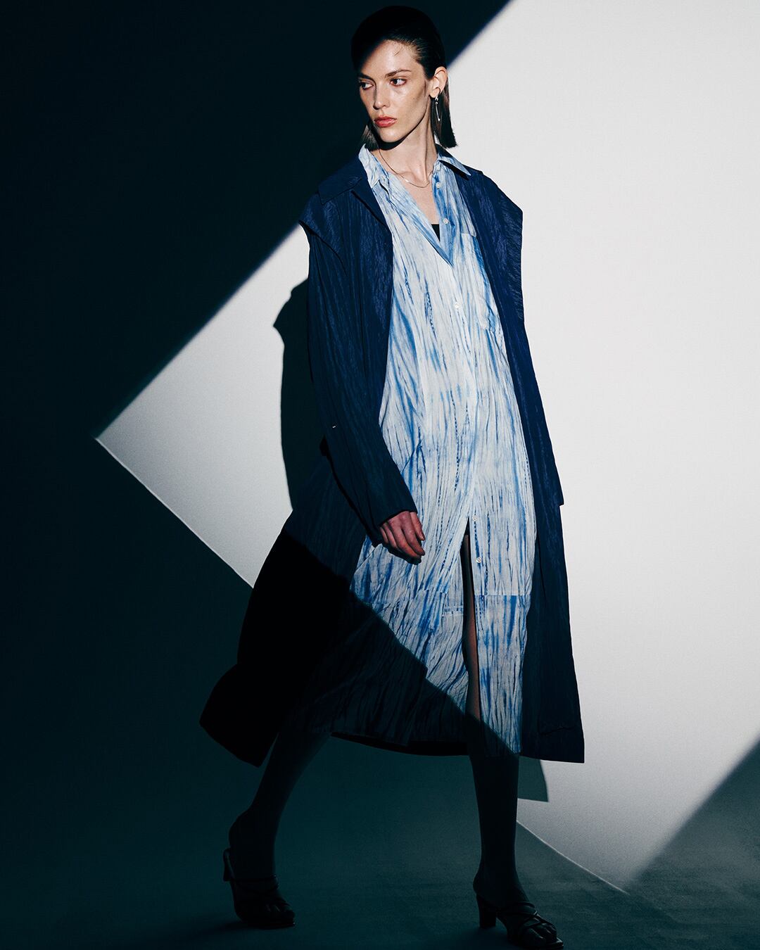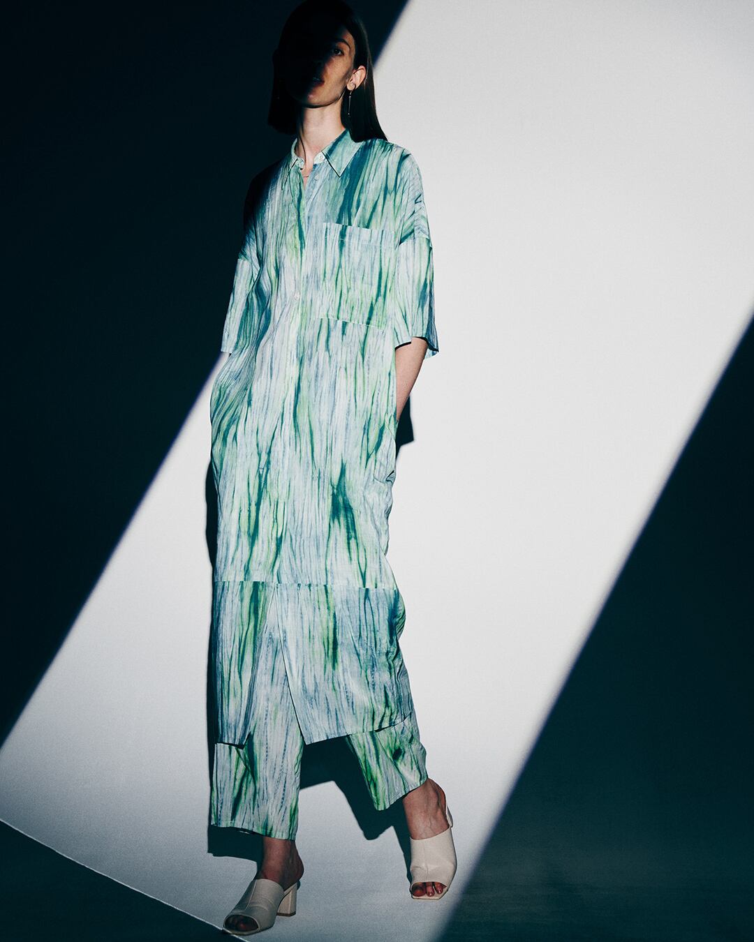 パネルライン・裾の切替など所々に切替をいれ柄が切り替わる印象的なデザインに。