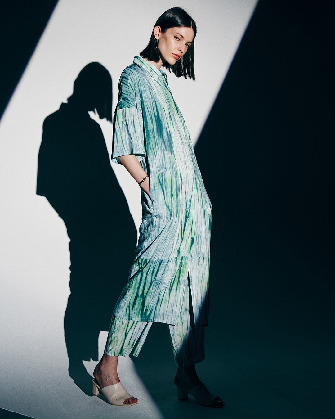 ほどよいツヤ感とナチュラル感のあるキュプラコットンリネンの混紡素材を特殊な手染めの染色方法”筒染め”で染め上げたオリジナルテキスタイル。