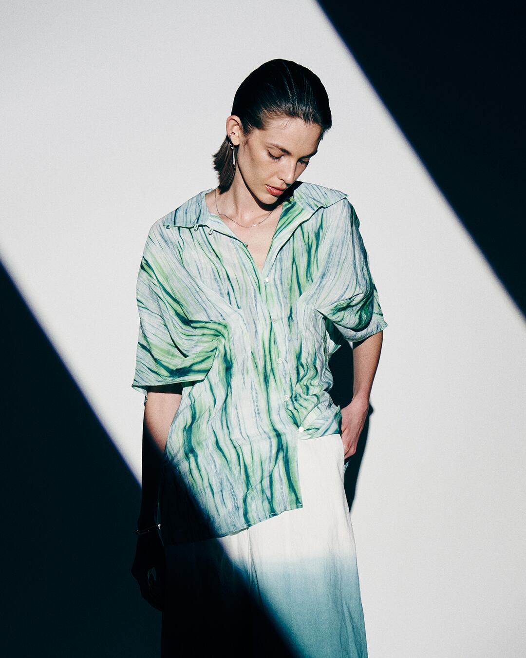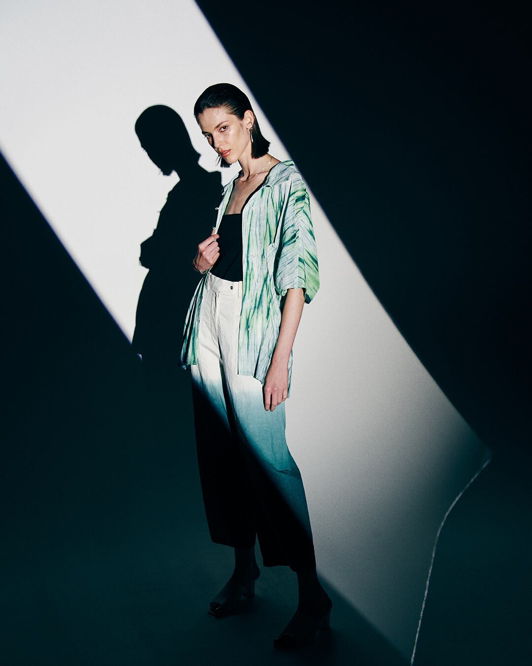ほどよいツヤ感とナチュラル感のあるキュプラコットンリネンの混紡素材を特殊な手染めの染色方法”筒染め”で染め上げたオリジナルテキスタイル。