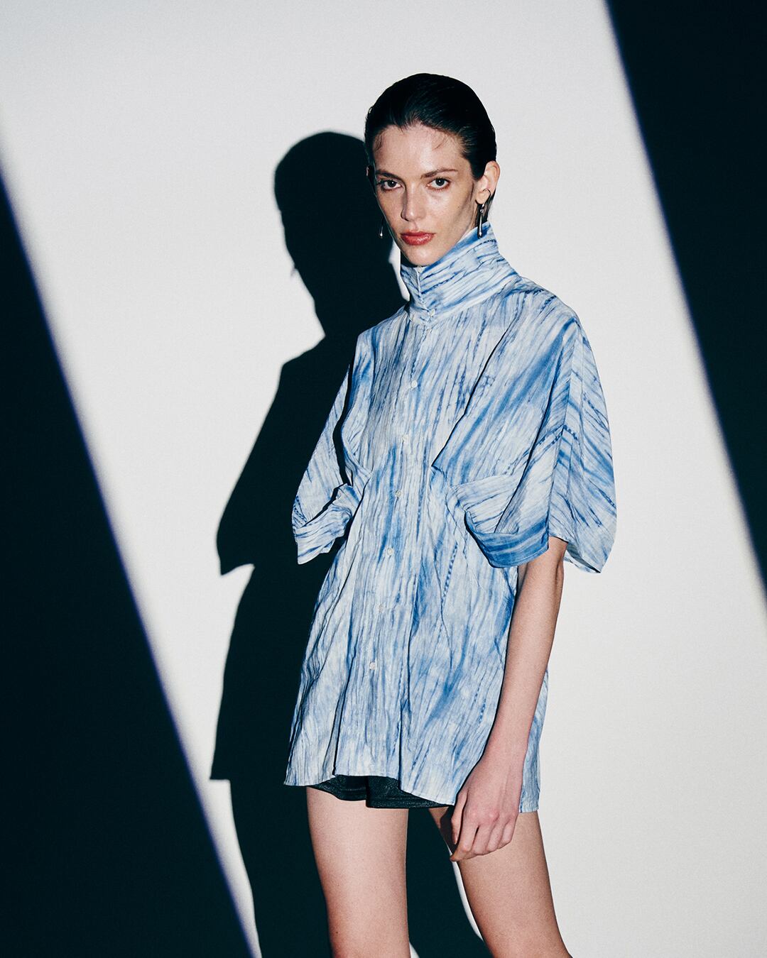 胸下に施したドレーピングのパターンが美しいシルエットのデザインタックシャツ。