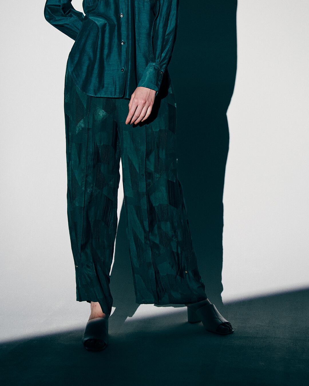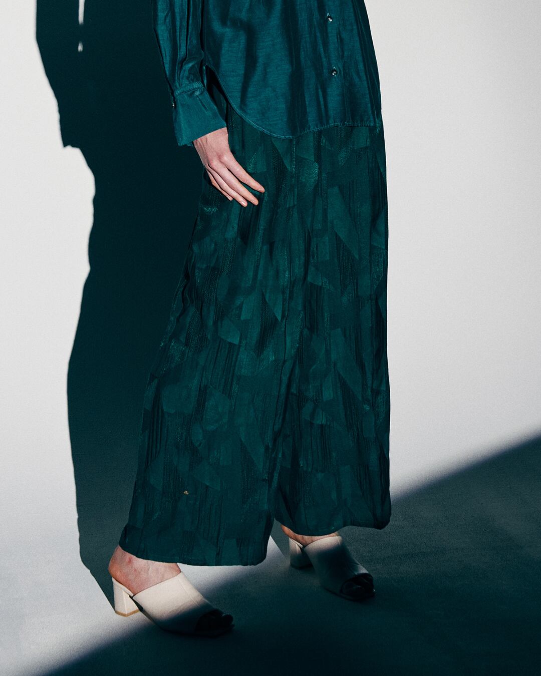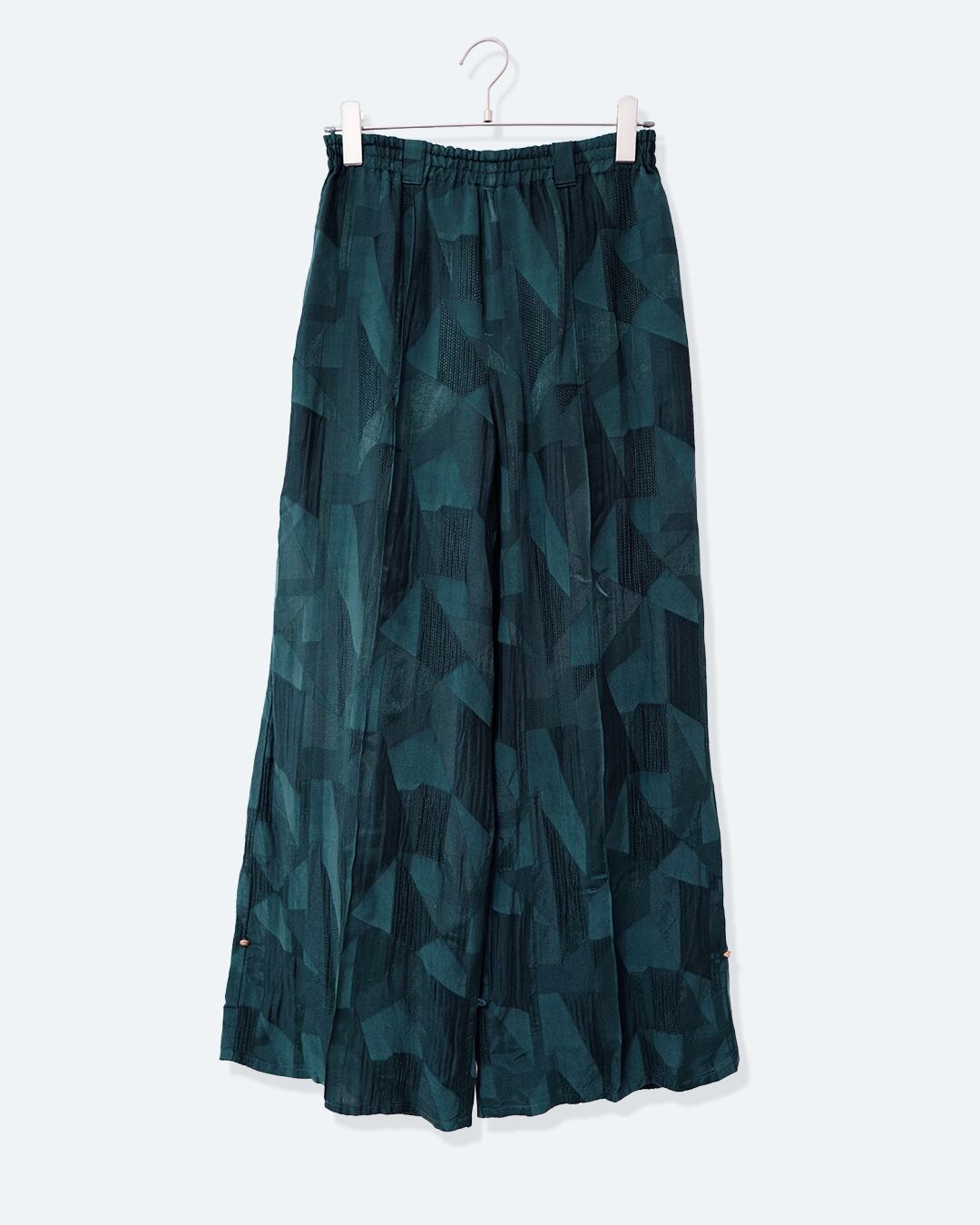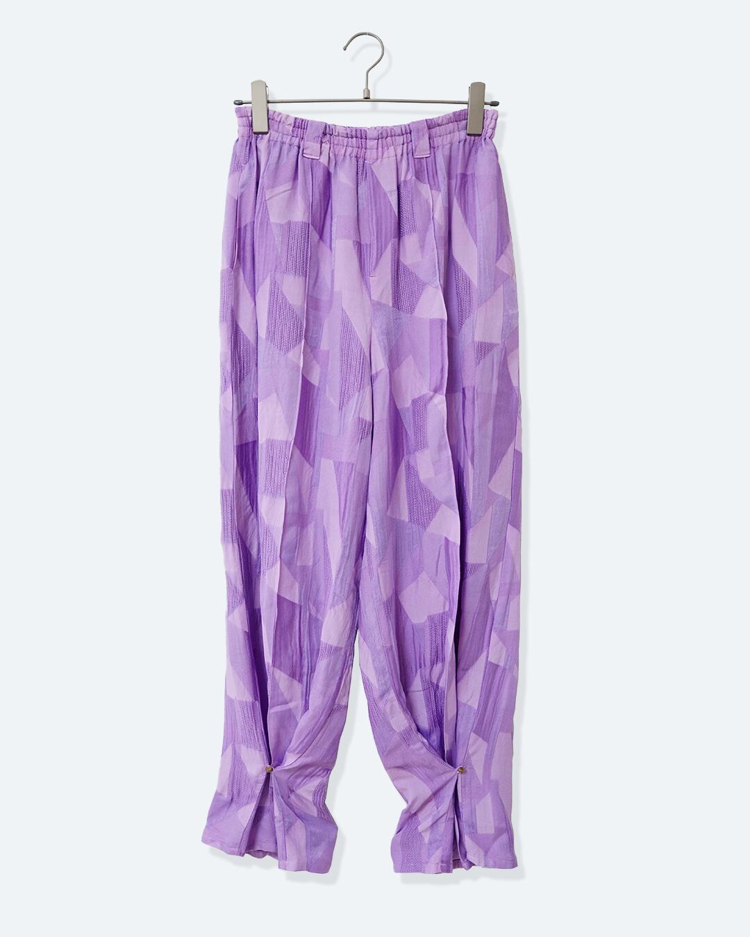 裾に施した釦とループを止めれば裾絞りになり違うシルエットがお楽しみいただけます。