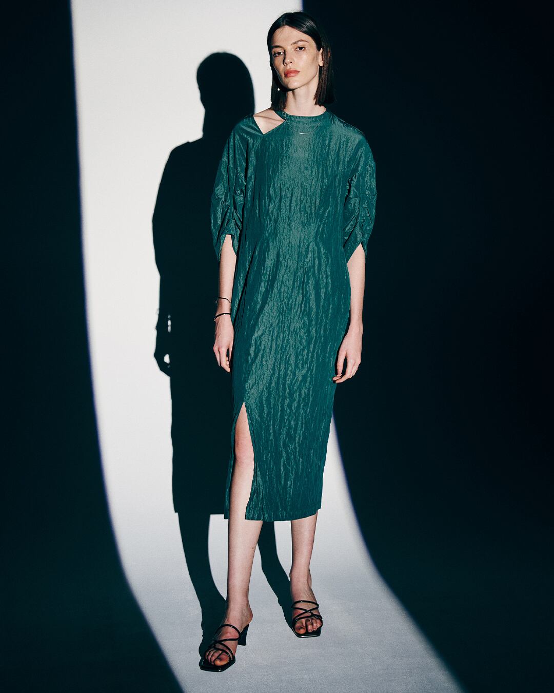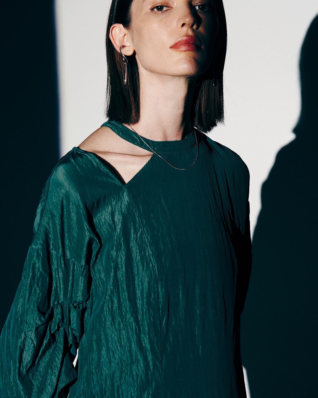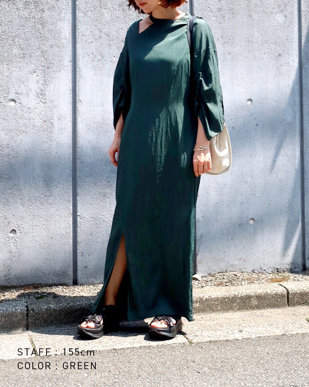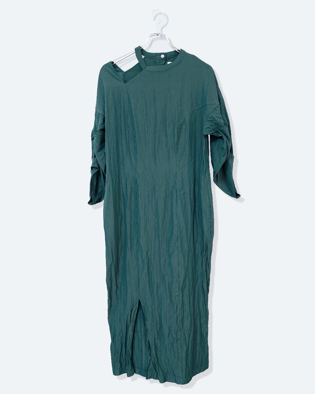 肩のカットオフラインが特徴的なデザインワンピース。