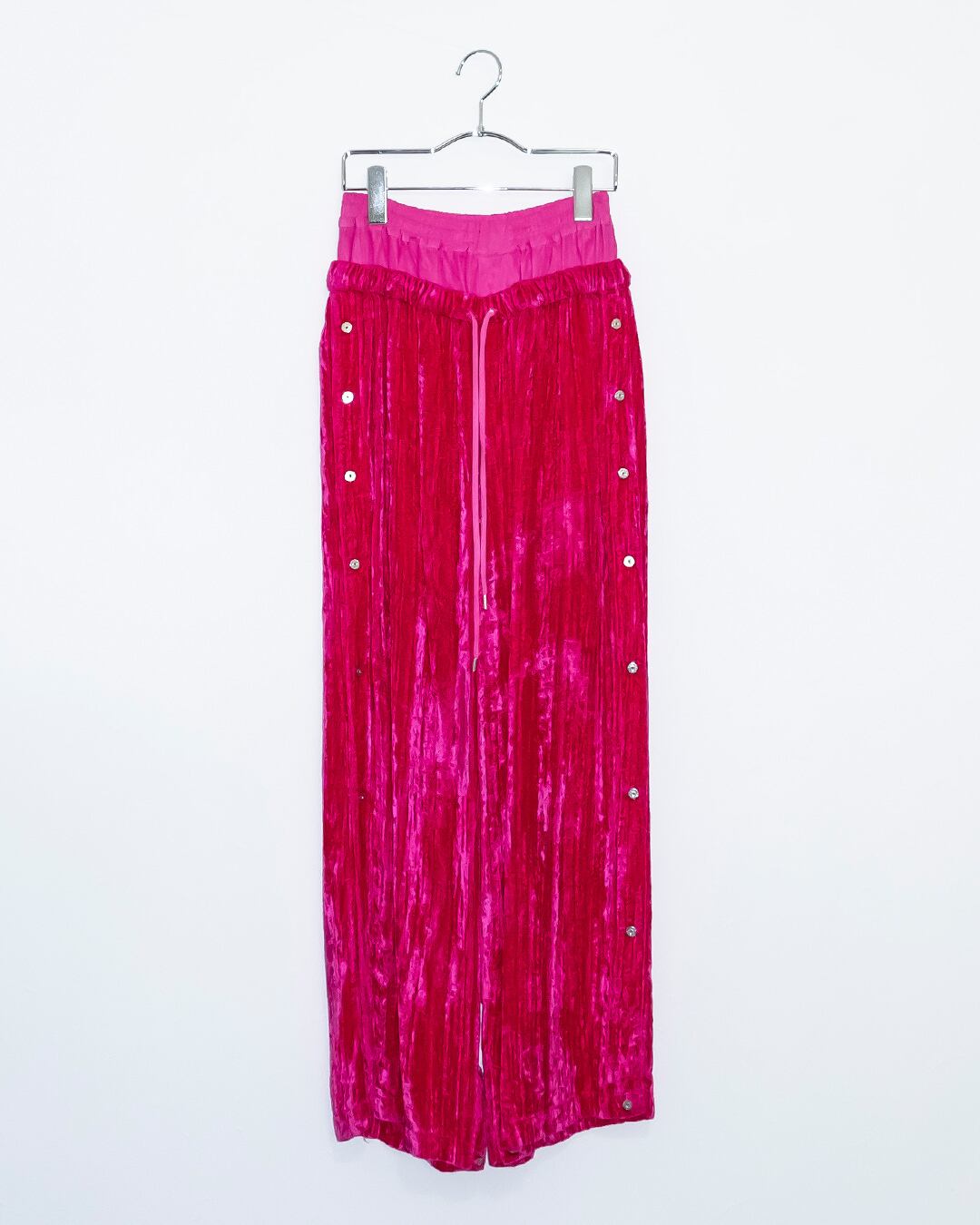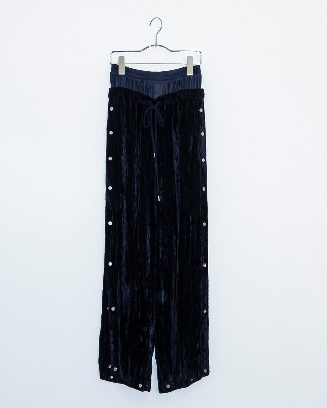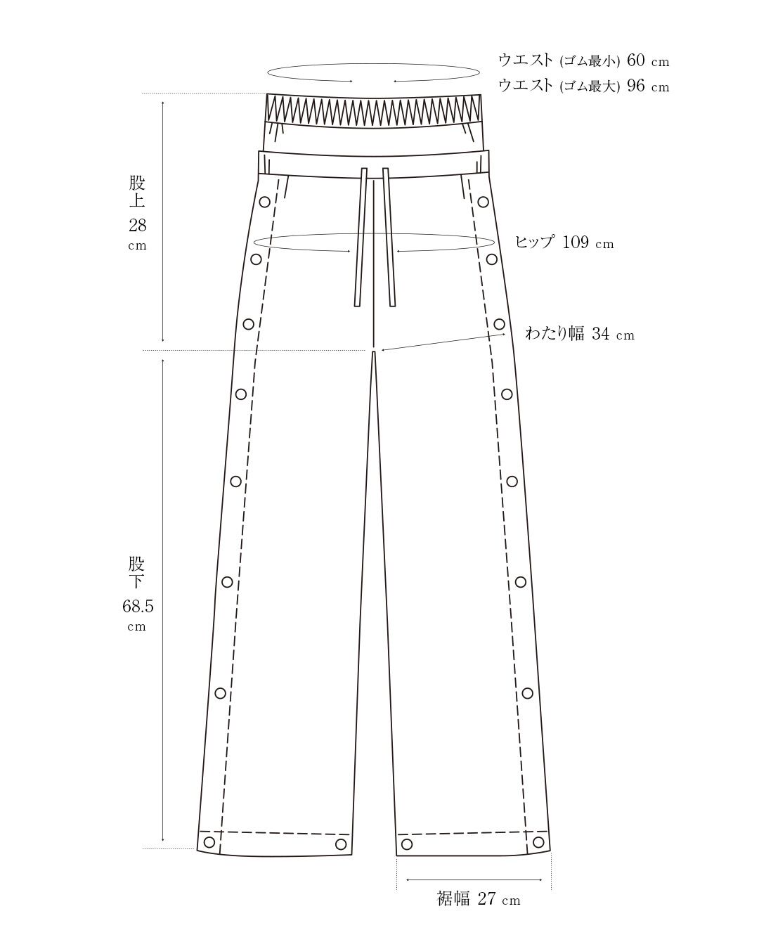 ウエスト上部とサイドのスナップを開けてスリットから見えるインナーショートパンツは別素材を使用。ショートパンツとレイヤードした様なデザイン。