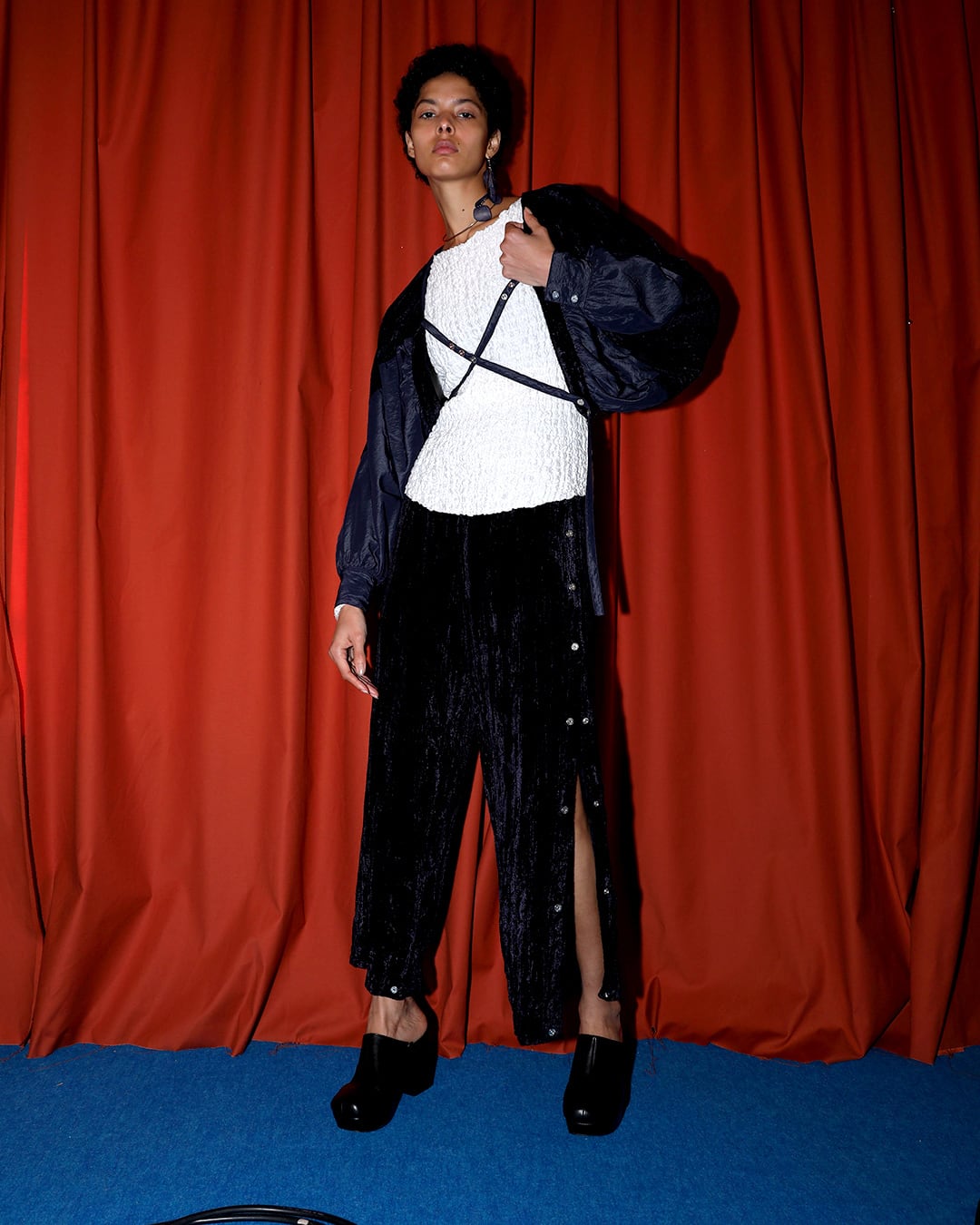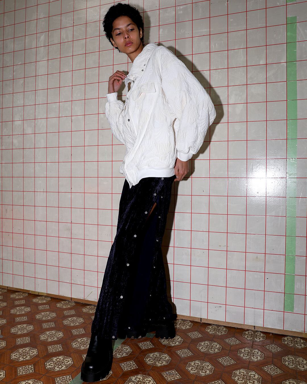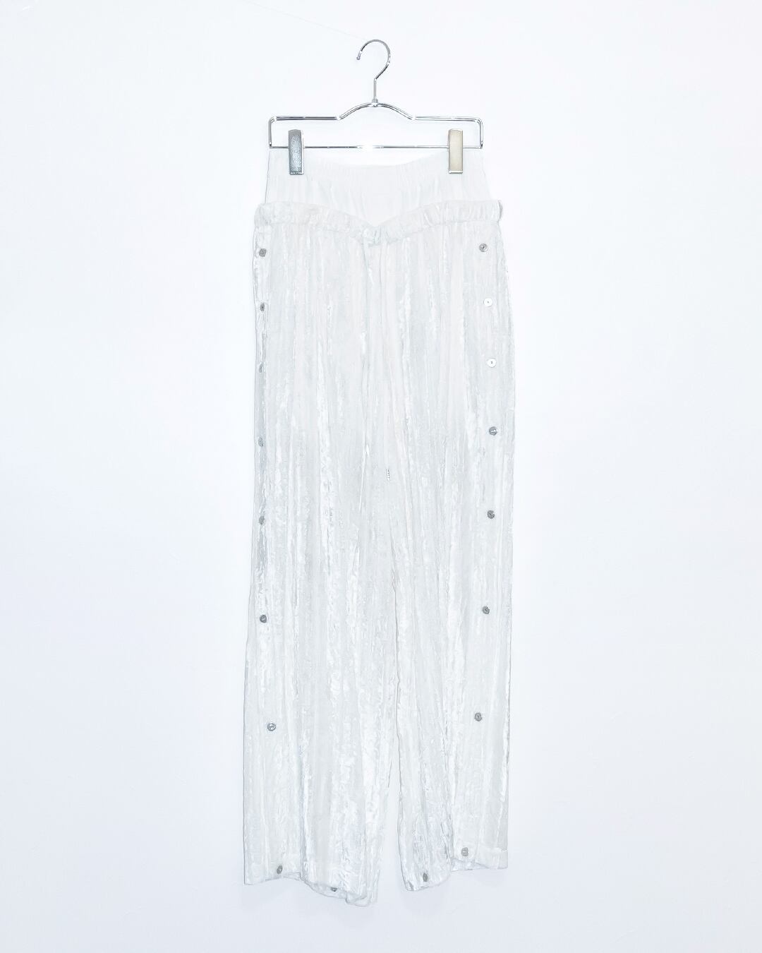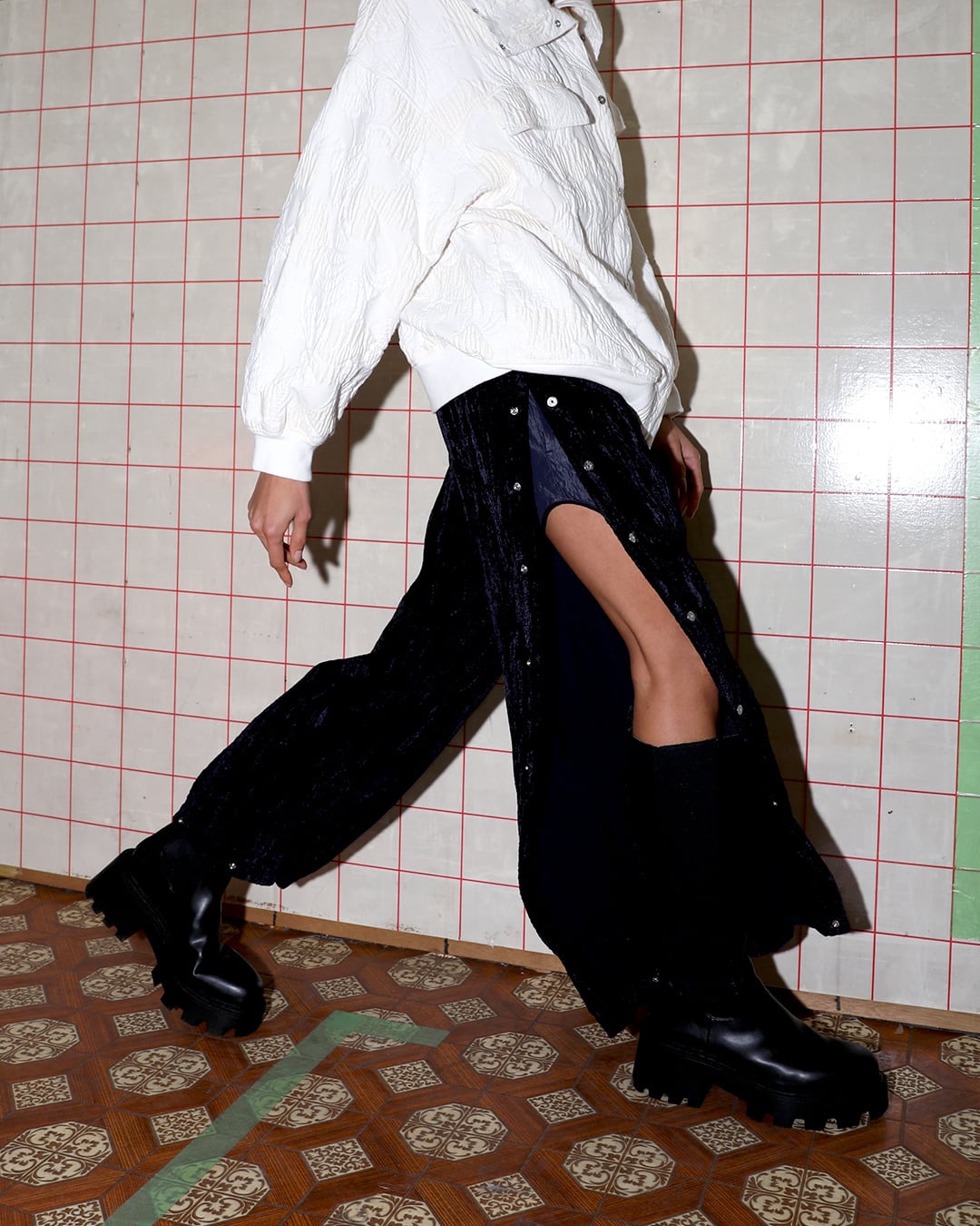 ウエスト上部とサイドのスナップを開けてスリットから見えるインナーショートパンツは別素材を使用。ショートパンツとレイヤードした様なデザイン。