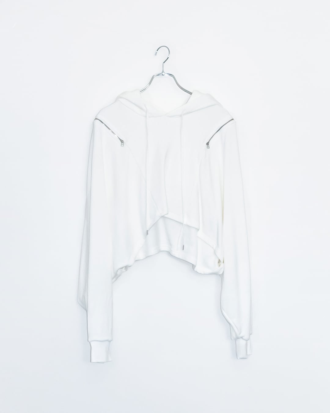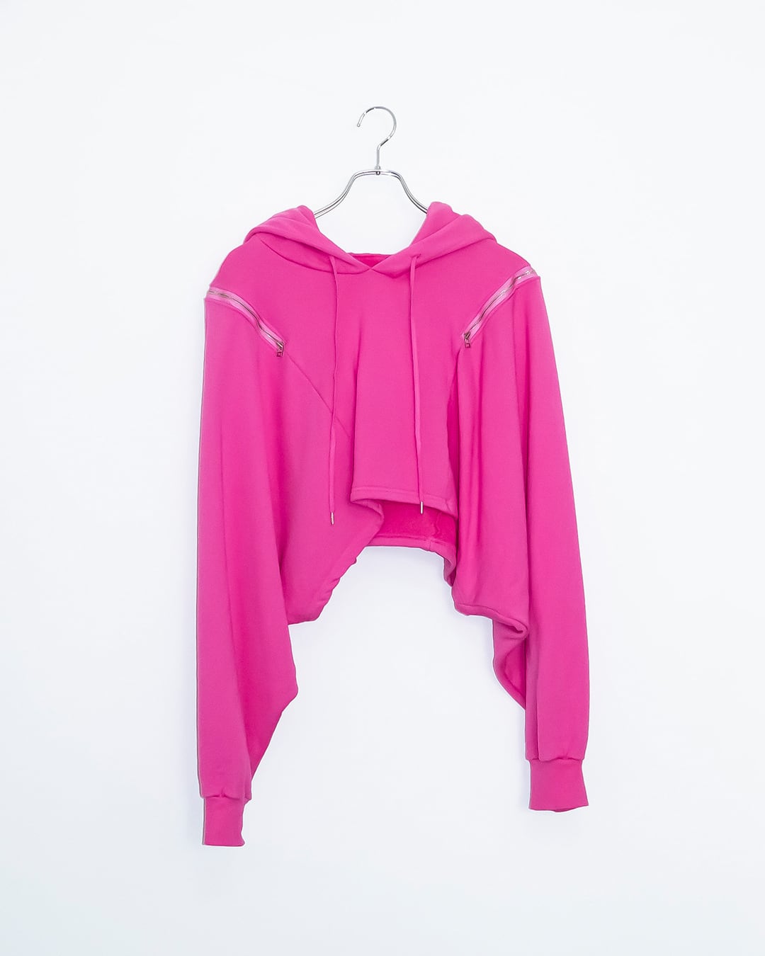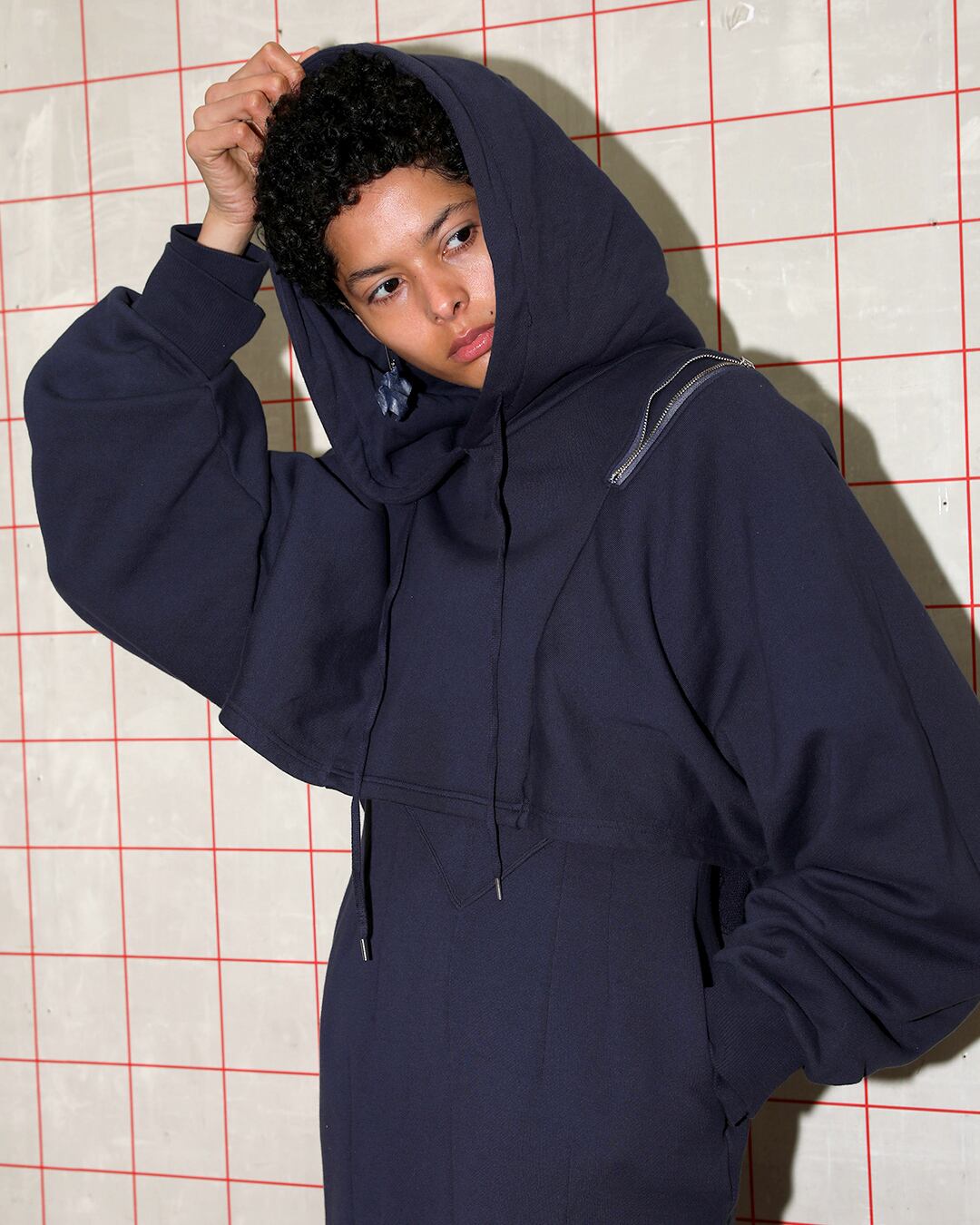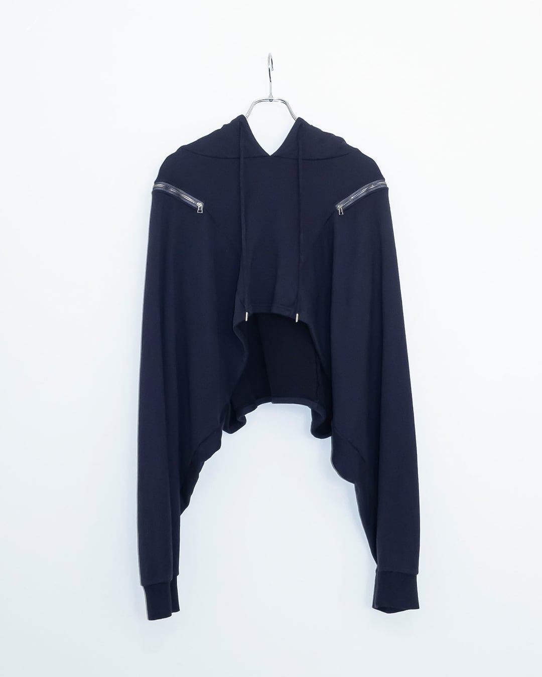 ショート丈のフーディー。かなり大き目のフードと長い袖が特徴的。