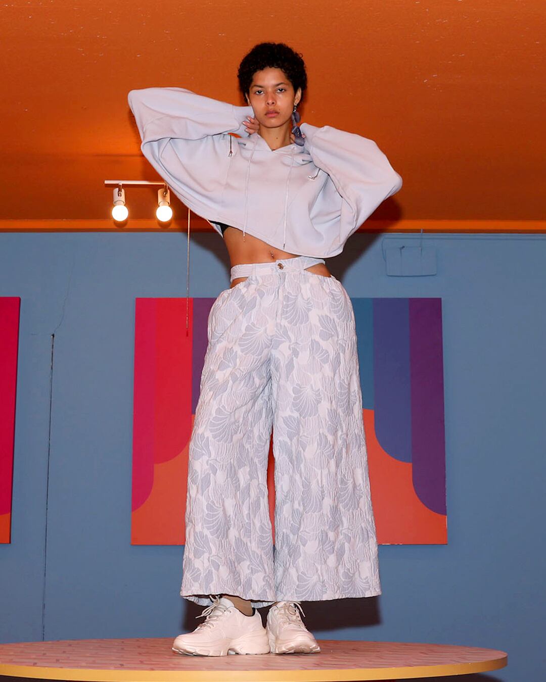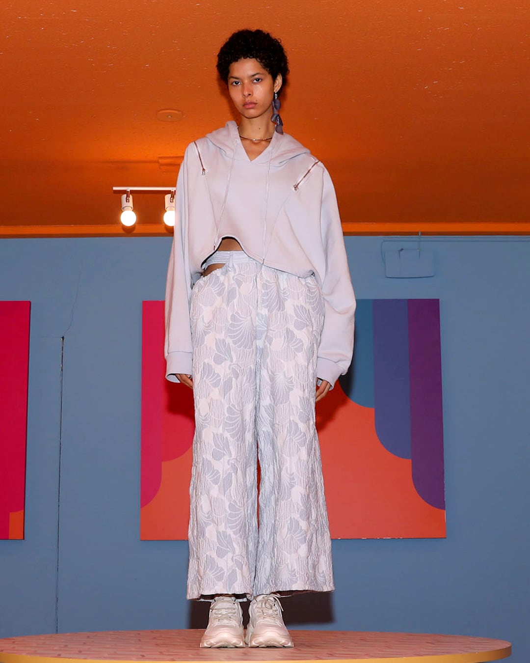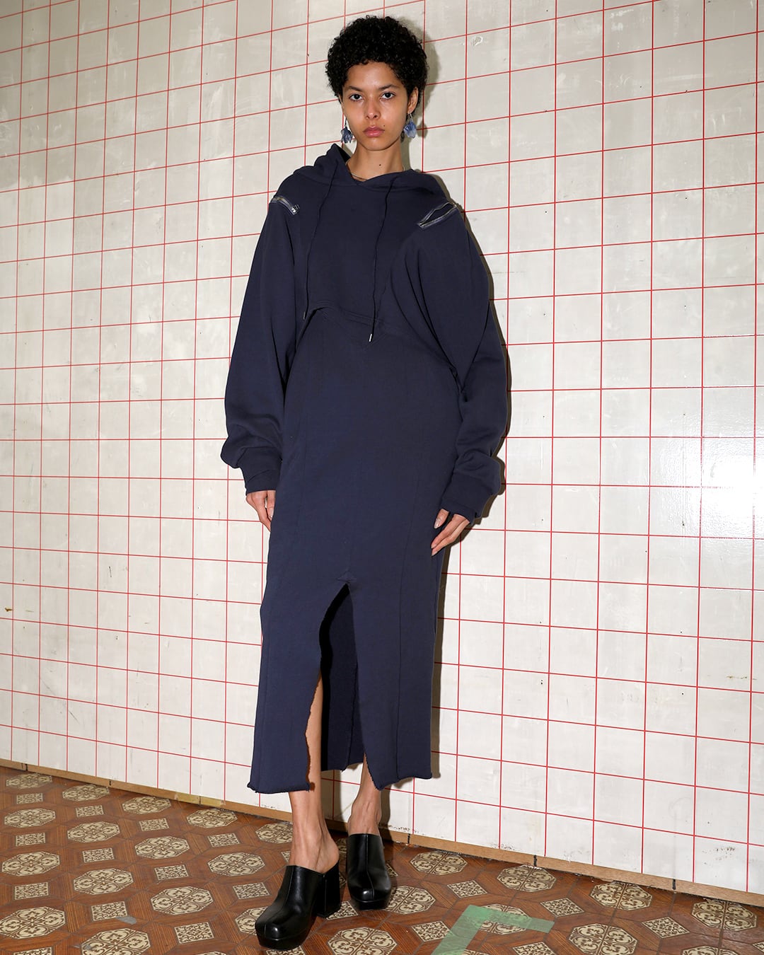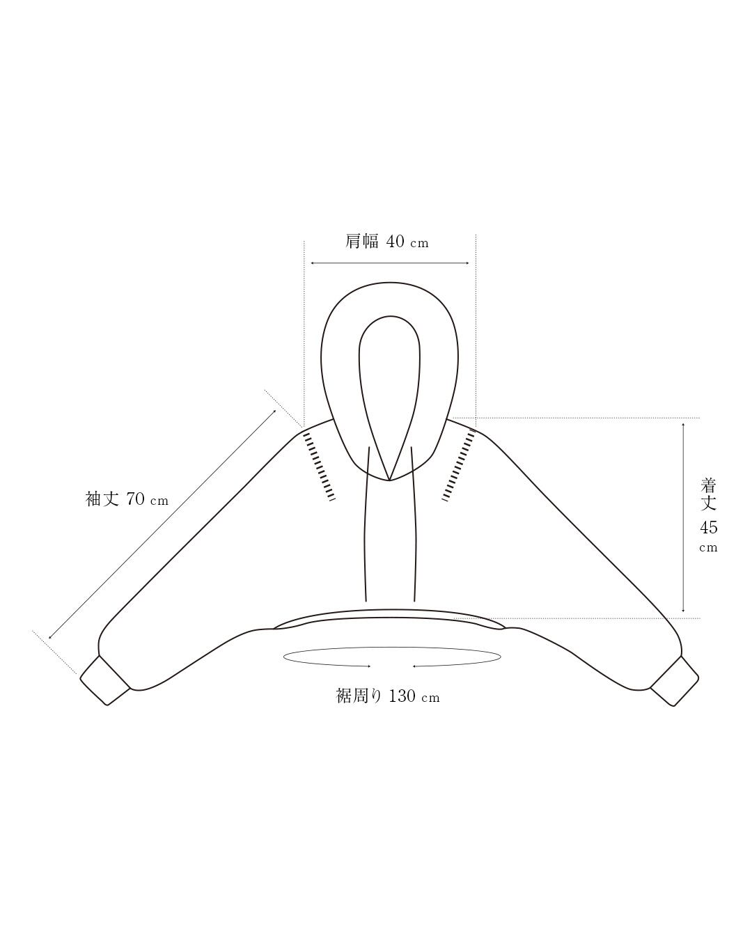 ショート丈のフーディー。かなり大き目のフードと長い袖が特徴的。